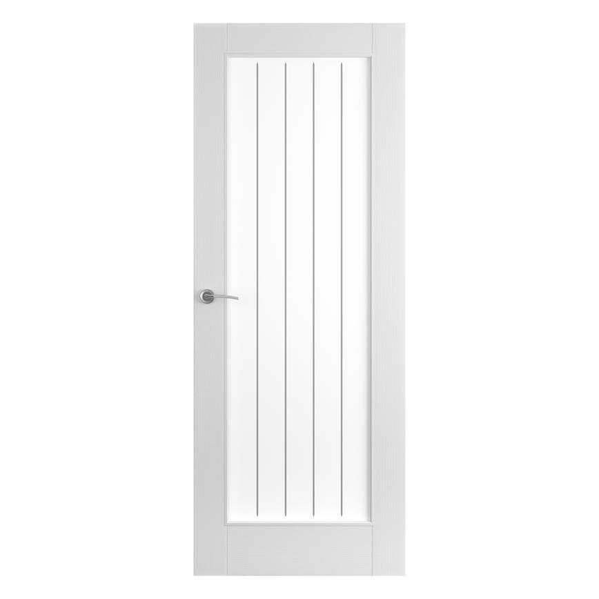 The glazed panel in the centre of this door introduces plenty of light, adding a bright and spacious look to a room alongside the grained white frame. Featuring an etched design the doorway is toughened to improve safety, while the stile-and-rail construction provides a decorative appeal. Choose from various widths to ensure a precise fit in different doorway sizes. Meanwhile, the primed finish saves time on painting and completing the fit.